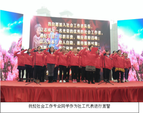 公司伟德国际bevictor社会工作专业的33名同学在系主任常岚老师以及罗竖元、罗艳萍和蒋星梅老师的带领下参加了此次社会工作宣传推介活动,其中三十名同学作为本次推介活动的社工代表,在活动中进行庄严的社工宣誓仪式。