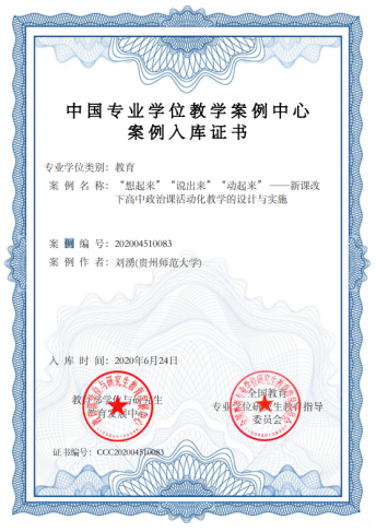 2020年6月,在全国教育专业学位研究生教育指导委员会(以下简称“教指委”)组织开展的第三届全国教育专业学位教学案例征集工作中,公司刘湧老师的教学案例《“想起来”“说出来”“动起来” ——新课改下高中政治课活动化教学的设计与实施》,经过教育部学位与研究生教育发展中心所属专业学位案例中心的严格评审,成功入选中国专业学位教学案例中心案例库。