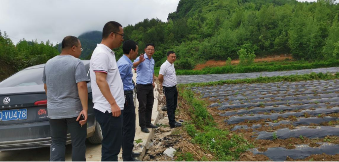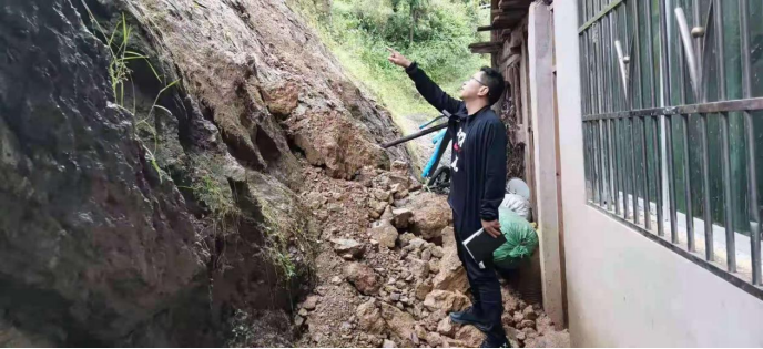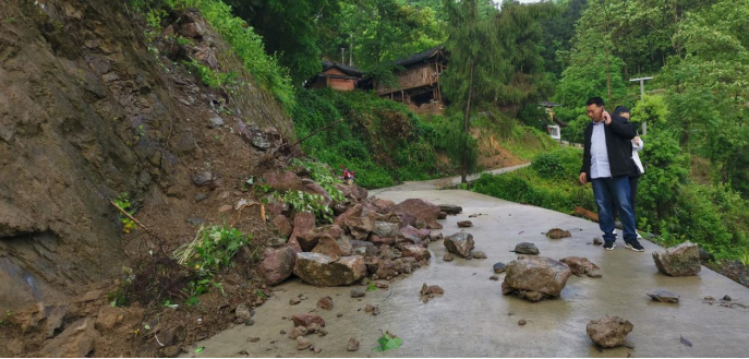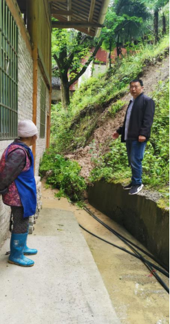 (石仟县连降暴雨,坡背村一些地段路基和村民房前屋后出现塌方现象,第一书记查春学同志带领驻村团队与村“两委”班子成员回探险情排除情况)