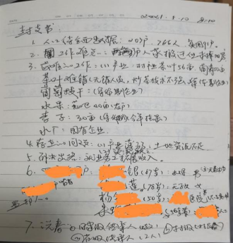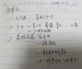 主动与自己的村支书村兼村主任封永同志详细了解村情,特别对坡背村特别供养户、村中产业发展现状、村里发展优势与不足等村情逐一记录。