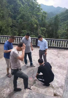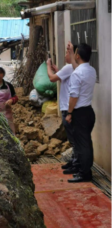 2021年5月11日夜间开始,石仟县连降暴雨,坡背村中路基和坡体有垮埸现象,村民屋前房后有塌方和家中雨水淹灌灾情,查春学带领团队成员罗运华、王波、郭娅在村支书封永同志的引领下奔赴村民组查看灾情。