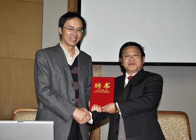 蔡永生副董事长(右)为刘海峰颁发客座教授聘书