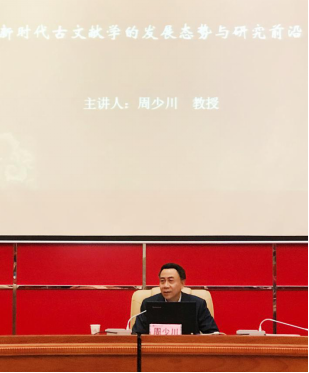 周教授首先深入阐释了新时期以来古文献学的发展态势,讲述了我国古籍整理现况及成就。他介绍了我国“国家古籍保护计划”的具体内容以及我国出土文献目前取得的成果,指出古籍数据化对于古文献的保存、整理、运用的重要意义。在谈及我国出土文献的发掘与整理时,周教授认为确定古籍数量对于弘扬中华传统文化、确立中华文化在世界文化中的地位有重要作用。其次,周教授谈及文献学的研究前沿,指出文献学研究应该注重交叉与综合的研究方法。他认为每个时期文献的发展都与当时社会发展密切相关,文献学的研究与社会史、文化史也密不可分,文献不仅是文献,也是社会政治经济发展的再现。最后他鼓励同学们发散思维,勇于创新,探索文献学发展新领域,为中国文献学的发展作出贡献。
