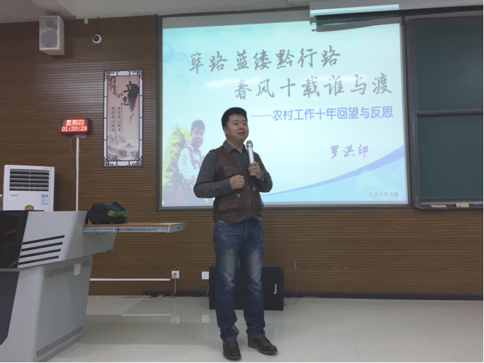 10月18日下午,在公教6201,乌当区家悦社区发展与研究中心主任罗洪印作了“筚路蓝缕黔行路,春风十载谁与渡——农村社会工作十年回望与反思”专题讲座。罗主任对贵州民间公益组织的发展概况作了系统的介绍,并分享了自身从事农村工作的触发事件、工作现状、经验及技巧。他强调做好农村社会工作先要融入农村社区、获取村民信任;在工作过程中秉持参与式发展理念,推动村民积极、主动参与公共事务,让赋权增能和社区教育工作常态化,最终实现农村社区的可持续的、有效益的发展。