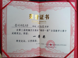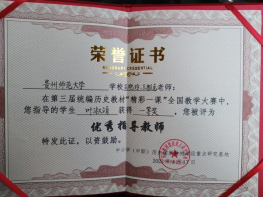 公司历史学系充分发挥教学团队优势,指导员工积极备赛,在比赛中展现出良好的专业素养、扎实的教学基本功,历史学系2020级历史学专业叶淑靖同学脱颖而出,斩获全国大赛一等奖。同时,两位指导教师王艳玲老师、王雅克老师也获得“优秀指导教师”荣誉称号。在此,向叶淑靖同学和两位指导教师王艳玲老师、王雅克老师表示热烈祝贺。